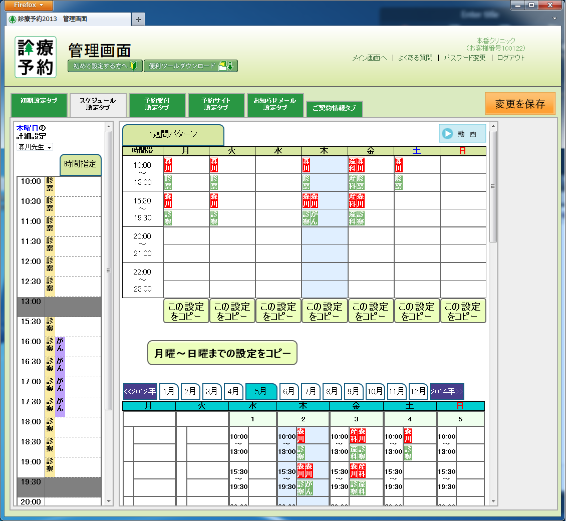 「スケジュール設定」には少しだけ苦労しましたが、それ以外の設定で困ることはありませんでした。理解して思うのですが、週間スケジュールを作成し、1か月のスケジュールにコピーして貼り付ける設定は直感的で便利だと思います。また、不定期にお休みや診療時間に変更が生じるときの変更がとても簡単なのもいいですね。予約システムで一番設定が大変そうなスケジュール設定の画面の作りは、なかなかいいところに着地していると思いました。