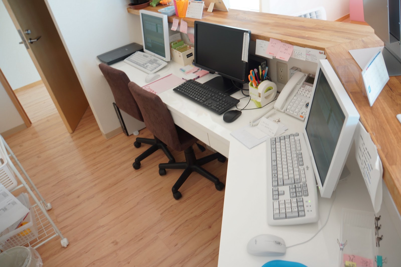 ▲受付に設置されたパソコン 中央モニタで予約管理 |